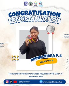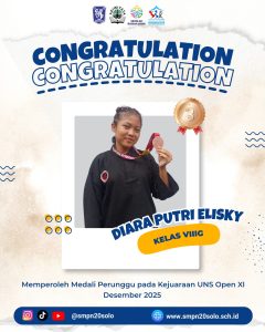 Kabar membanggakan datang dari tim Pencak Silat SMP Negeri 20 Kota Surakarta pada kejuaraan UNS XI Open bulan Desember 2025 di GOR UNS. Para atlet menunjukkan performa yang luar biasa dan berhasil membawa pulang sejumlah medali, mengharumkan nama sekolah.