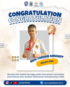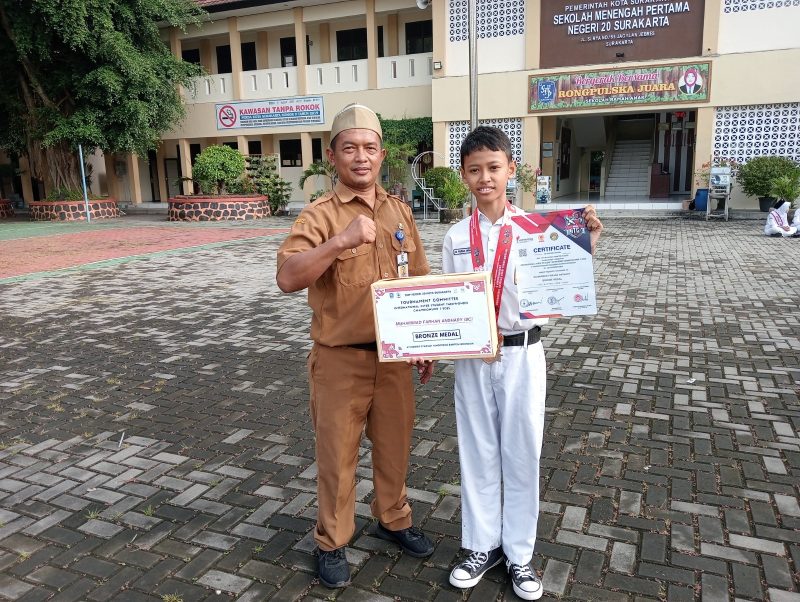 Kabar membanggakan datang dari bidang keolahragaan oleh ananda Muhammad Farhan Anshary (kelas 8C), yaitu keberhasilan meraih medali perunggu pada ajang Tournament Committee International Inter Student Taekwondo Championship 3 tahun 2025. Turnamen ini diselenggarakan di Indoor Stadium Tangerang, Banten, pada 26 – 28 Desember 2025. Turnamen ini bersifat internasional dimana tidak hanya diikuti oleh peserta dari berbagai daerah di Indonesia, tetapi juga diikuti oleh peserta dari beberapa negara. Tujuan turnamen ini adalah meningkatkan kualitas atlet, penanaman nilai disiplin dan sportivitas, serta memantau dan menjaring calon atlet berprestasi untuk pembinaan jangka panjang. Dengan pencapaian ini diharapkan menjadi inspirasi dan motivasi para murid SMP Negeri 20 Kota Surakarta untuk ikut serta dalam kesempatan bertanding pada berbagai ajang kejuaraan.